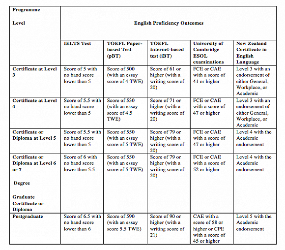 高等院校:多數(shù)新西蘭高等院校要求申請(qǐng)人熟練掌握英語(yǔ)。以下是NZQA發(fā)布的新西蘭各高等院校對(duì)英語(yǔ)水平的最低要求。注意這僅僅是最低要求,實(shí)際要求會(huì)根據(jù)你所學(xué)的專業(yè)而有變化,部分特定項(xiàng)目或院校對(duì)學(xué)生的英語(yǔ)要求可能會(huì)更高。